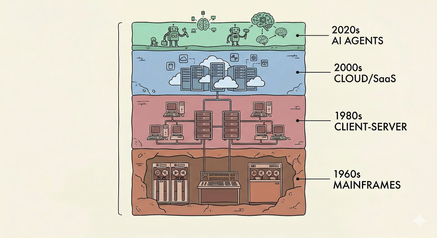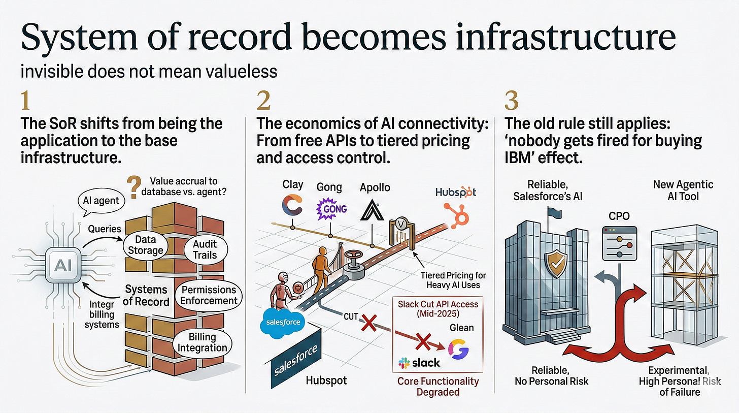 Instead of sales reps logging into Salesforce, agents will query it. And these agents will need a place to store data, maintain audit trails, enforce permissions, and integrate with billing systems. The SoR shifts from being the application to the base infrastructure.
