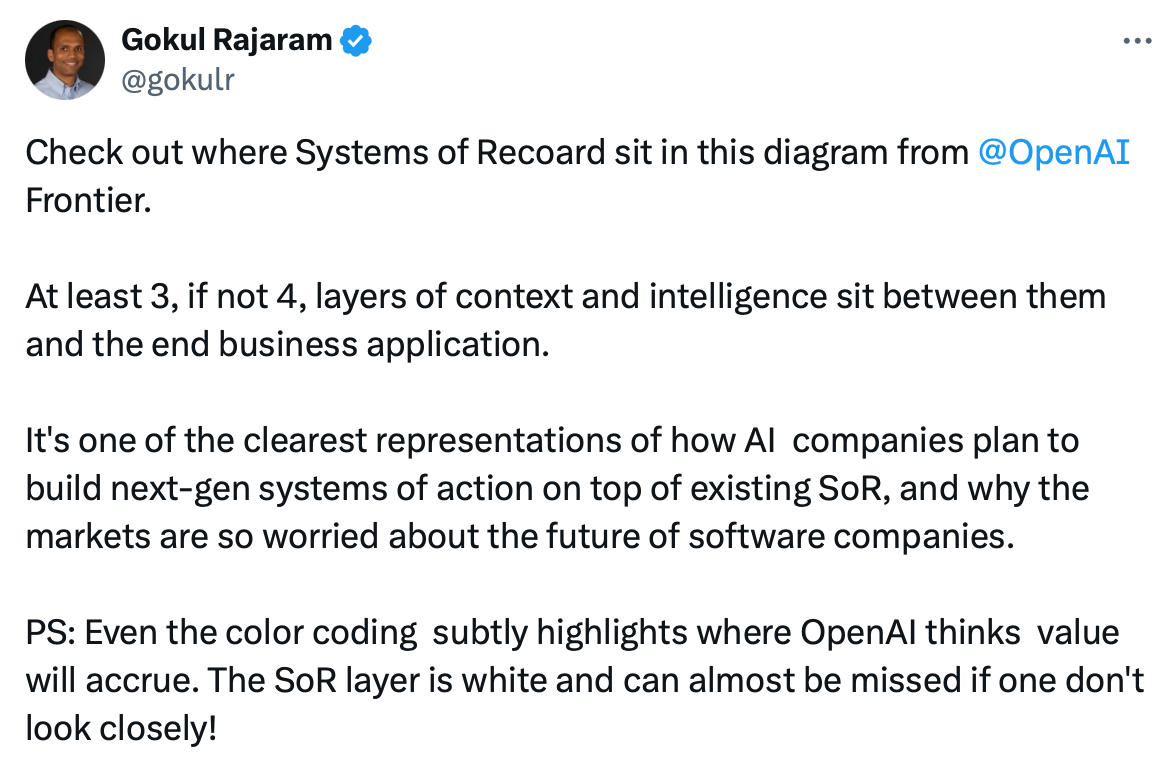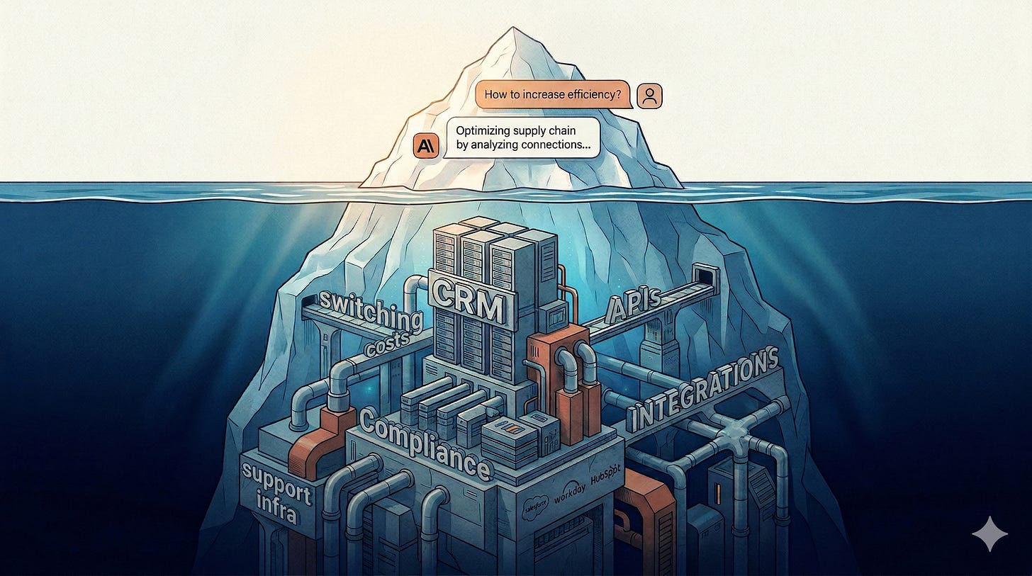 But systems of record are the dataset of how a business operates with custom fields that encode institutional knowledge. Integration logic connects the CRM with billing, marketing, finance and support functions. It is the source of truth for an organization, deeply embedded in all functions.